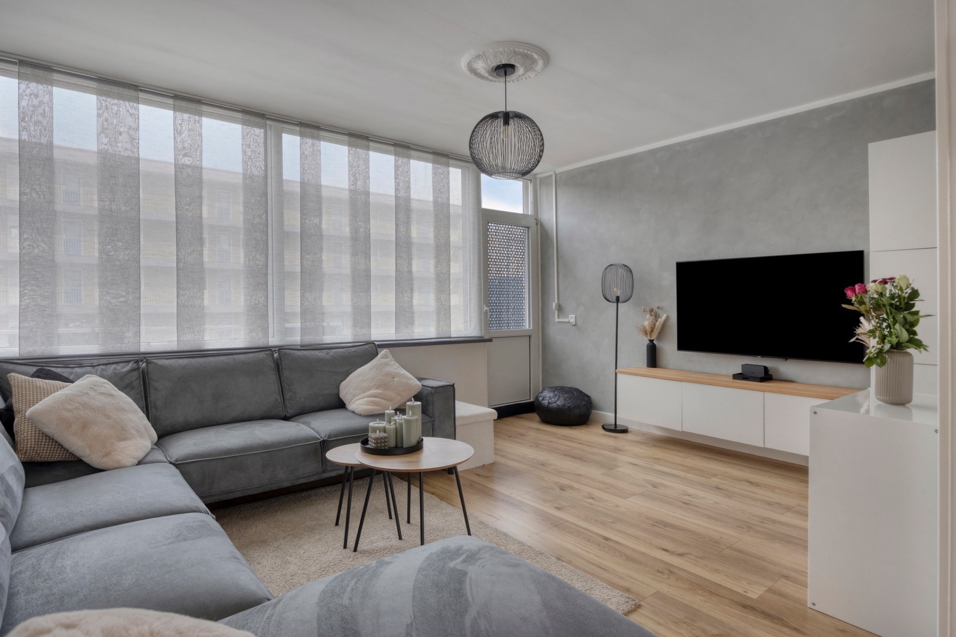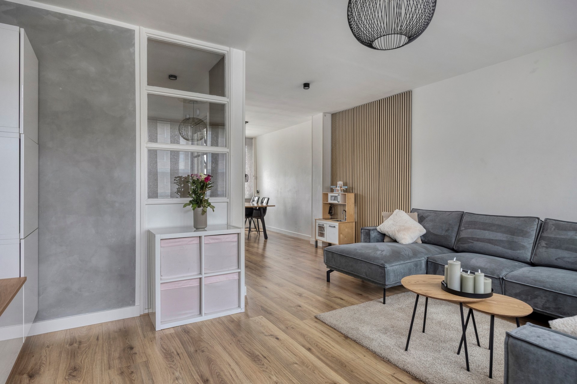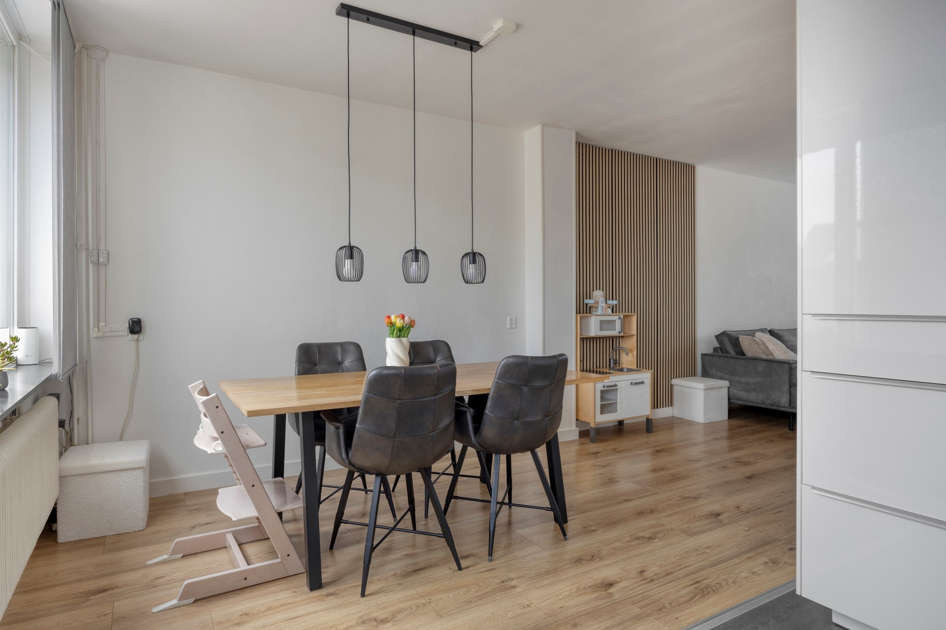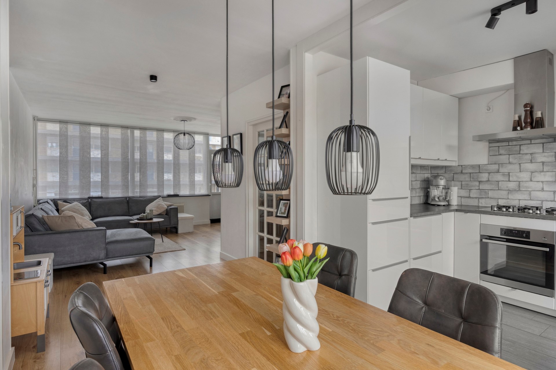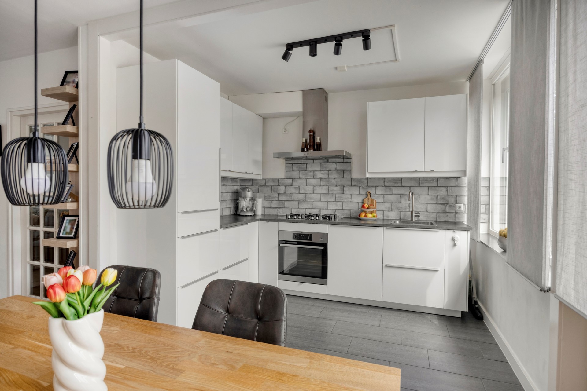 De keuken staat in open verbinding met de woonkamer en is praktisch ingedeeld. Vanuit de woonkamer is het balkon aan de achterzijde bereikbaar, wat zorgt voor een prettige extra buitenruimte op deze verdieping.