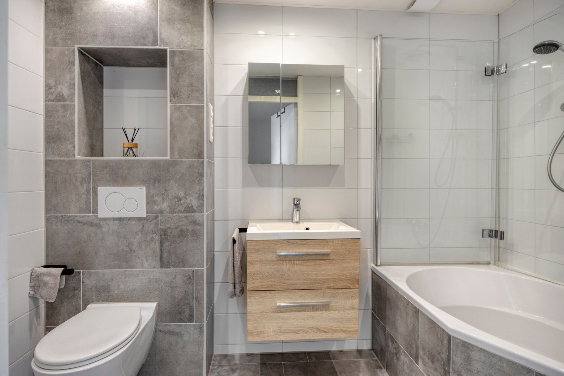 De twee slaapkamers op deze woonlaag zijn van goed formaat en daardoor geschikt als slaapkamer, werkkamer, hobbyruimte of logeerkamer. De moderne badkamer ensuite is verzorgd afgewerkt en voorzien van een inloopdouche, wastafelmeubel en toilet.